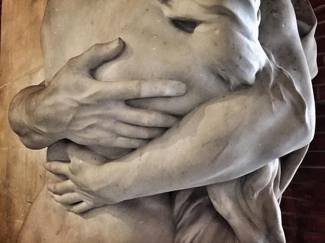 L’uomo e la donna sono completamente nudi e fra loro lo scultore interpose solo un panneggio che in qualche modo potesse rendere meno scandalose le due figure appoggiate l’una all’altra.