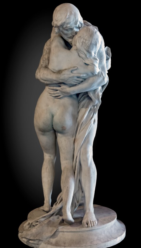 It depicts a passionate embrace between two young people after they meet again after having been separated and apart for a long time. The man and the woman are completely naked and the sculptor only placed a drapery between them that could somehow make the two figures leaning against each other less scandalous.