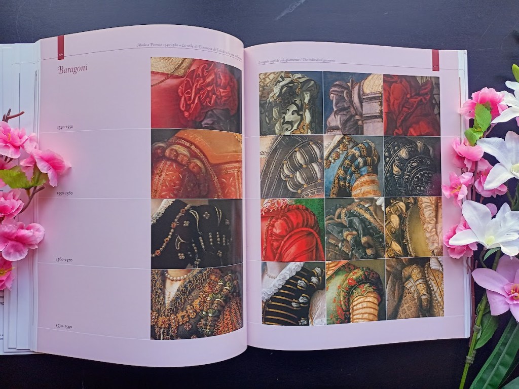 Nel volume Moda a Firenze 1540-1580.Lo stile di Eleonora di Toledo e la sua influenza troverete raccontati nel dettaglio non solo gli abiti della duchessa ma anche tutti quei vezzi che dalla sua entrata a Firenze in poi diverranno consuetudine per le dame più facoltose come per esempio la doppia foratura dei lobi delle orecchie o l’utilizzo di raffinate gorgiere.