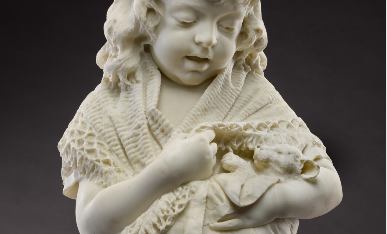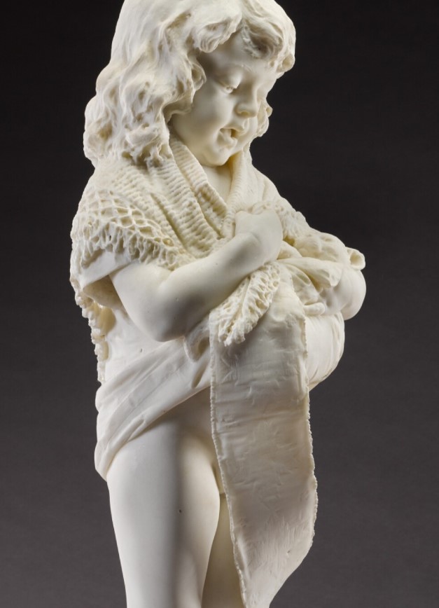 The little girl, with her mouth open, seems to be singing a dirge to the kitten who looks at her in ecstasy. The rendering of the wool cape sculpted in marble that warms her shoulders is admirable, with those fretwork and those plumes that make it so similar to an item of clothing widely used at the time.