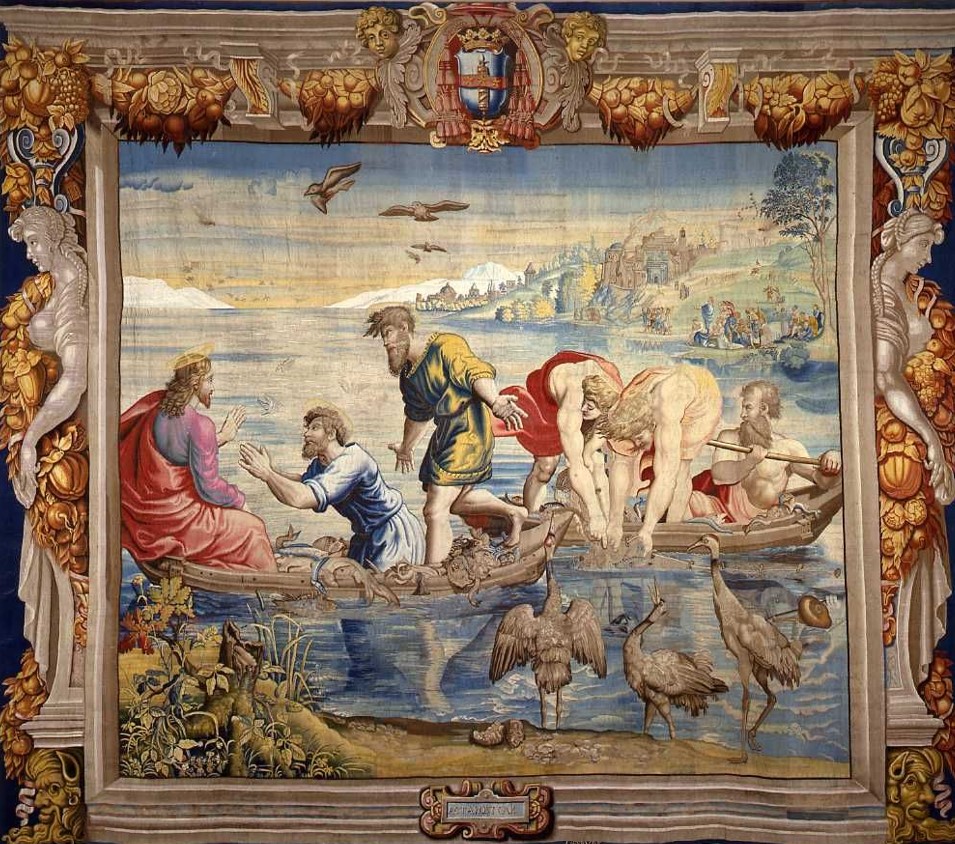 The tapestry woven with wool, silk and gilded silver threads depicts the scene told in the Gospel of Luke in which, after a poor catch, Christ orders the fishermen Andrew and Peter to lower their nets again.