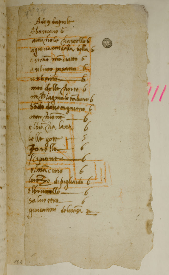 In altri fogli invece si riconosce un disegno a matita rossa a mano libera relativo alla pianta di una delle finestre inginocchiate di Palazzo Medici Riccardi che progettai attorno al 1524.
