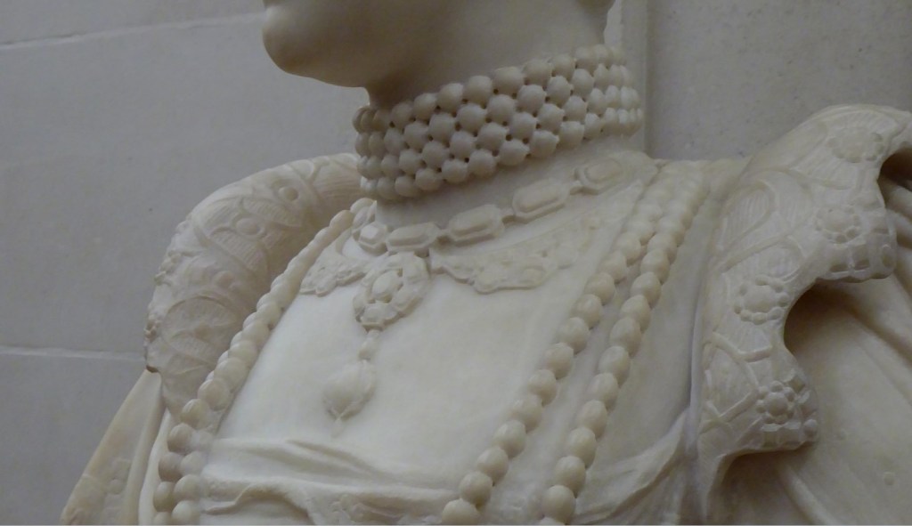 Osservate la cura che pose nel realizzare le diverse collane che indossa e con quanta cura scolpì nel marmo le pieghe della stoffa dell’abito e i pizzi che lo decorano.