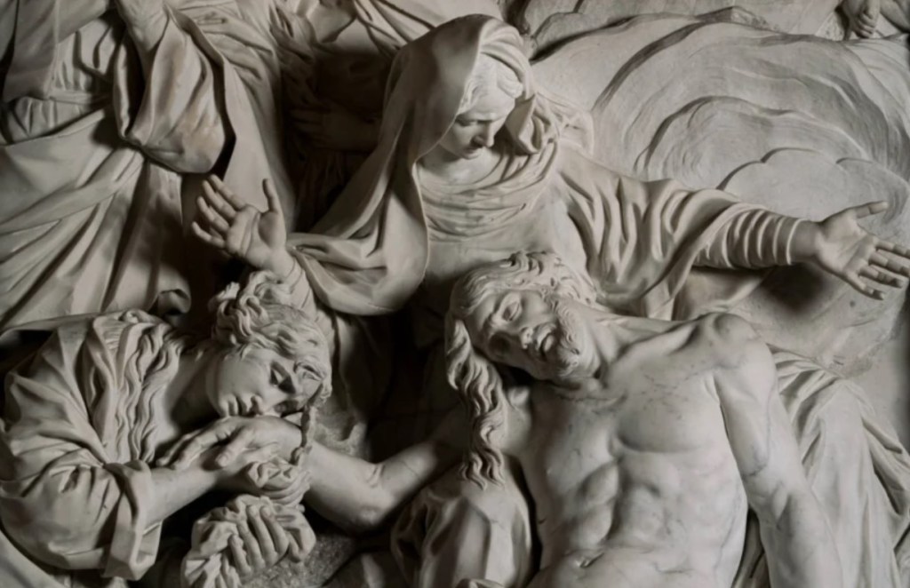 The Body of Christ has come down from the Cross. Lifeless he was made to sit down. Her torso is supported between the draped legs of the grieving Mother who spreads her arms with a dramatic gesture as she watches what they have done to her Son.