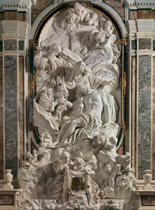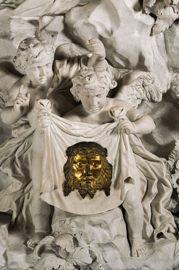 Lo scultore incluse nell’opera anche il tabernacolo posizionandolo all’interno del sudario di Cristo, sostenuto da due putti e chiuso dal volto in bronzo del Salvatore con in capo la corona di spine.