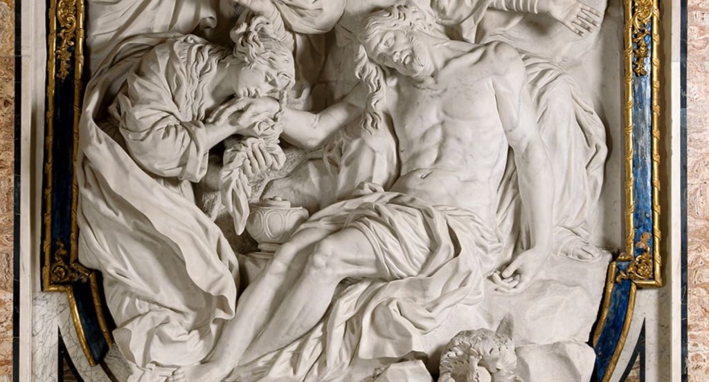 A sinistra Maddalena con la schiena ricurva, appoggia il volto e i fluenti capelli alla mano ferita dai chiodi sostenendola.