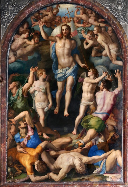 Bronzino interpreted the moment of the Resurrection in his own way since no person was present in the Gospels but the fact was witnessed by the empty tomb, by an angel who appeared to the pious women and by the subsequent apparitions of Christ.