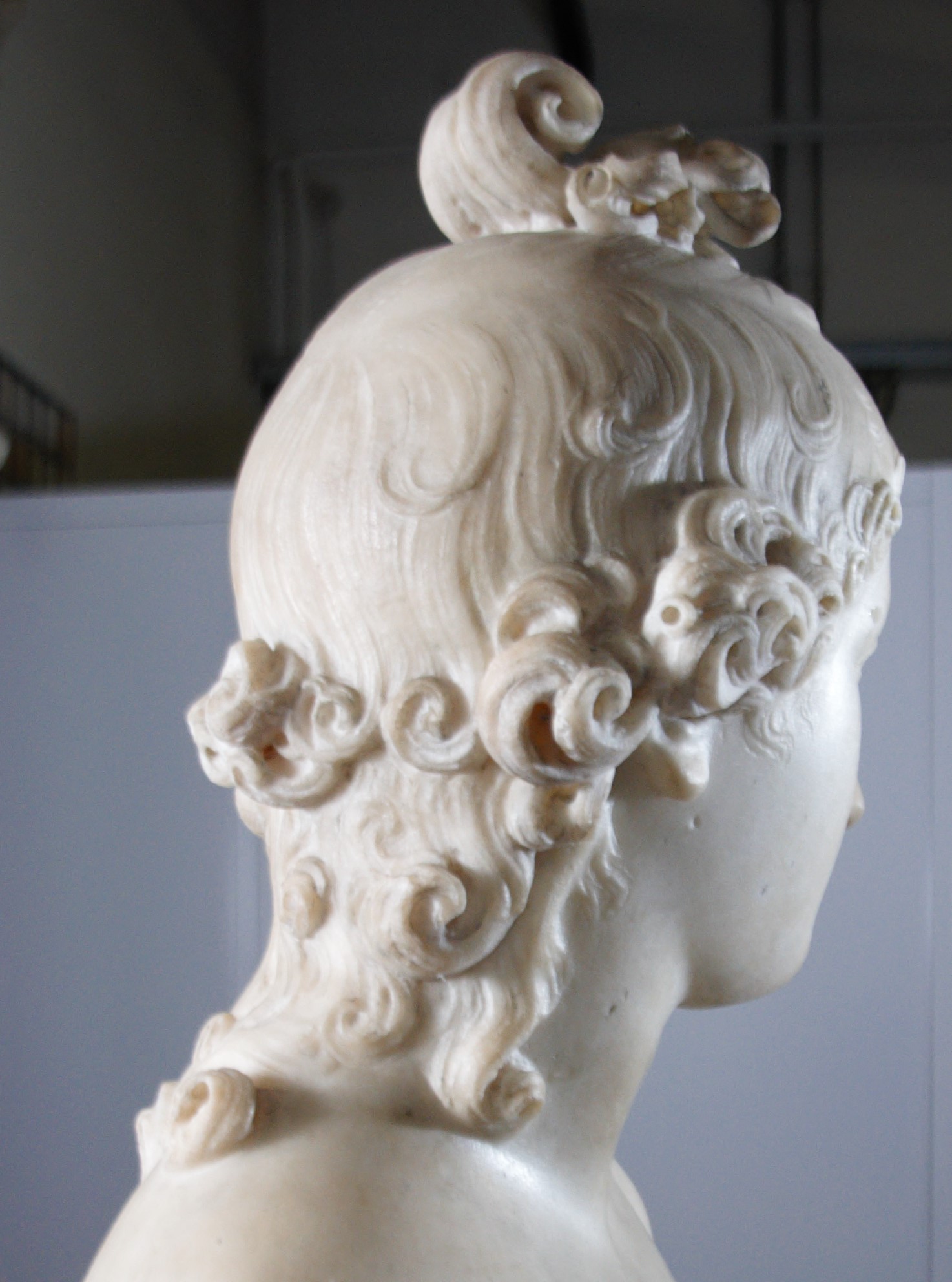 Canova scolpì l’opera a tutto tondo posizionandola su un piedistallo concepito come un’antica ara, decorato con festoni vegetali trattenuti da nastri e borchie sul fusto.