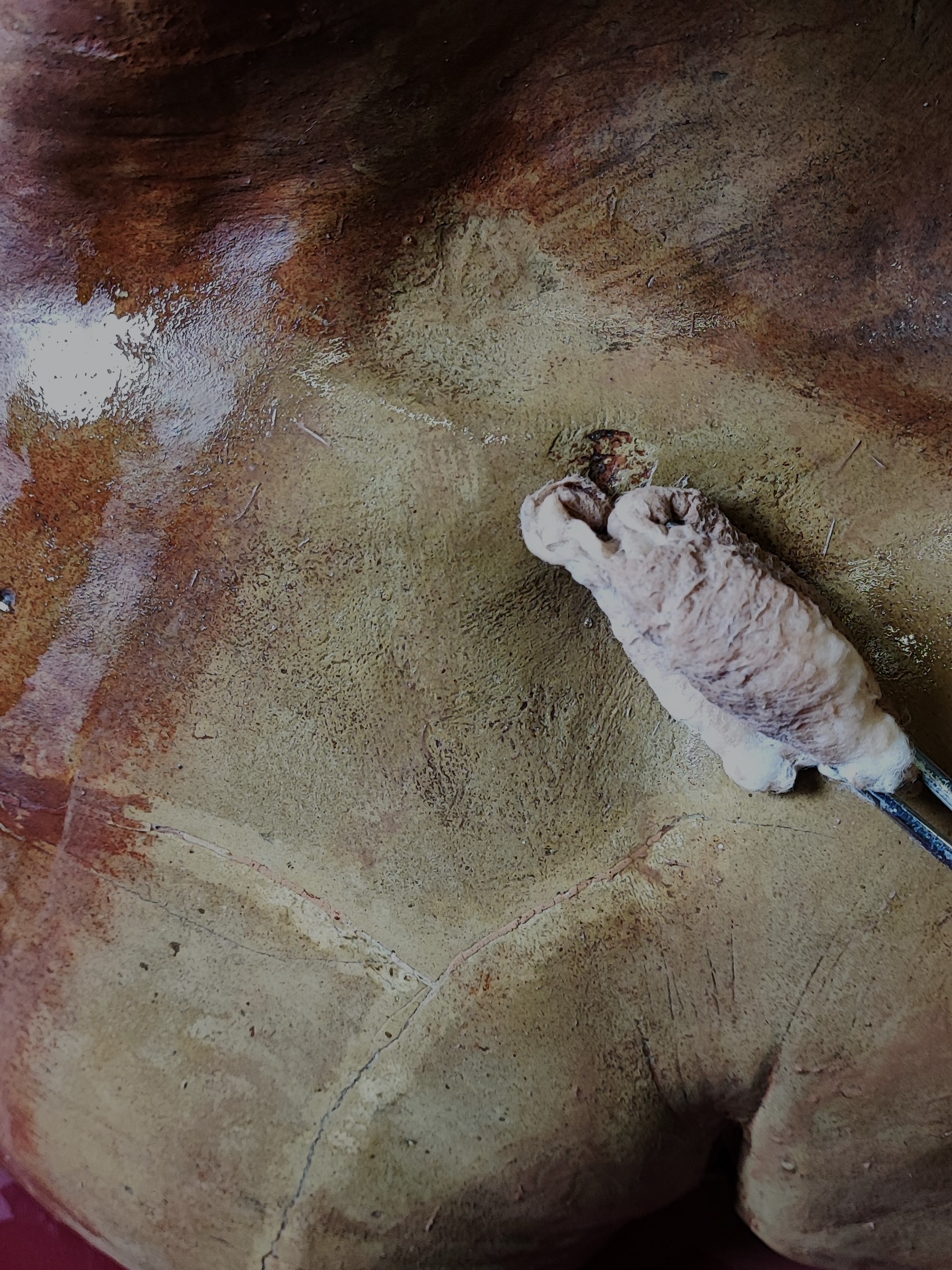 Un altro elemento molto evidente era il collante utilizzato per riassemblare i vari frammenti che ha determinato la fuoriuscita con abbondanti colature dalle fratture.