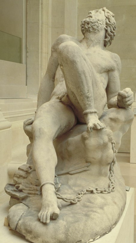 Pradier scolpì nel marmo il Prometeo incatenato che guarda verso il cielo, in attesa che torni ancora un volta l’acquila a straziare le sue le carni. La posa del corpo del titano, permise all’artista di mostrare per intero la sua capacità di modellare le membra.