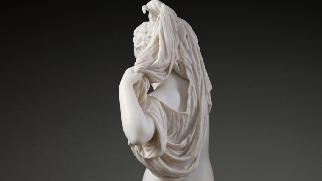 A sorprendere è la resa del panneggio che la giovane solleva al di sopra del capo e che ancora le avvolge le spalle, lasciandole le natiche nude.