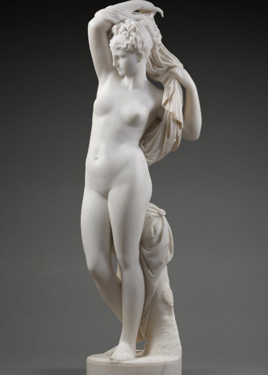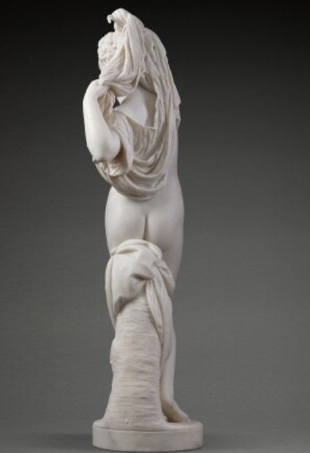 What is surprising is the rendering of her drapery which the young woman raises above her head and which still wraps around her shoulders, leaving her buttocks bare.