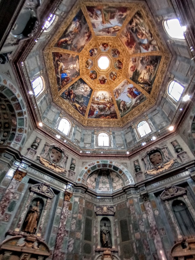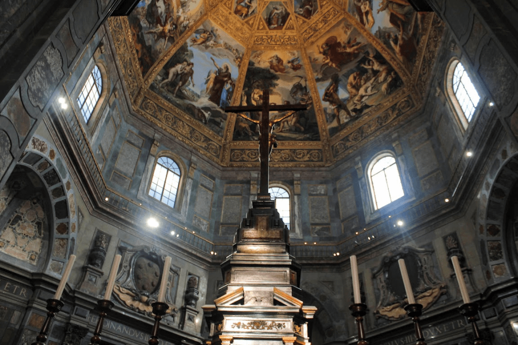 His brother Don Giovanni de’ Medici, wanted to put the idea he had of this chapel in black and white while the architect Matteo Nigetti, in 1604, actually started the works. The original project was then modified in the following years in some parts by Buontalenti. The dome that dominates it, 59 meters high, is the second tallest in Florence after Brunelleschi’s gigantic one.