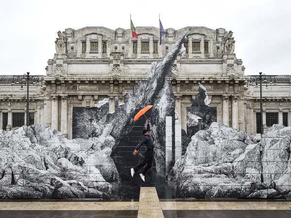 Mentre all’interno è presente la mostra immersiva An Invitation to Dream di Moncler, l’esterno della stazione accoglie la monumentale installazione dell’artista francese JR: “La Nascita”.