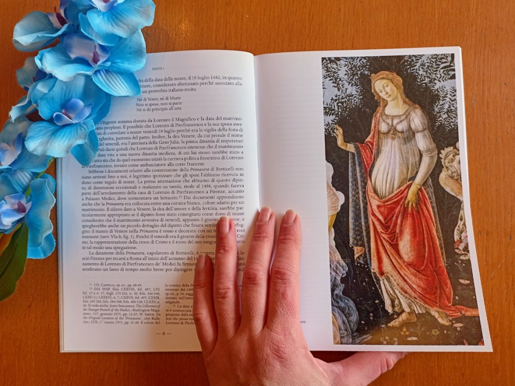 Il volume ha inizio con il controverso dibattito che ha inizio dalla notizia data dal Vasari che fa riferimento all’opera come commissionata da Lorenzo di Pierfrancesco, esponente cadetto della famiglia Medici, per il Palazzo fiorentino di Via Larga, come una Venere “che le grazie fioriscono, dinotando la Primavera”