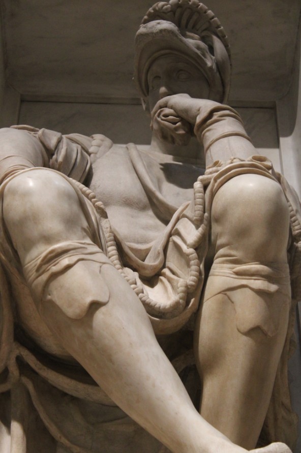 The clear hours of the day, i.e. those that represent darkness and light, have dynamic poses and are located below the duke who seems more active and less reflective: Giuliano. The passing hours, Twilight and Dawn, have a more languid and less decisive attitude. It is no coincidence that I wanted them placed at the feet of the thoughtful Lorenzo.