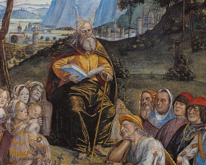 Il racconto degli Ultimi atti della vita di Mosé, ormai giunto assieme al suo popolo sulla sponda orientale del Giordano, ha inizio a destra del riquadro.