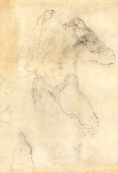 Wilde, regarding this drawing, wrote that “The complex stretching and twisting of the body, so characteristic of Michelangelo’s figurative style in the early 1530s, were abandoned in the figure as executed, and the action of the arms was correspondingly modified”.