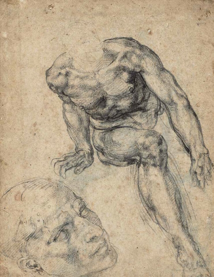 A testimonianza di ciò rimane il foglio acquisito dal Teylers Museum di Haarlem nel 1790 dal corposo nucleo di disegni di Casa Buonarroti in cui si vede lo studio dettagliato del corpo a carboncino su carta.