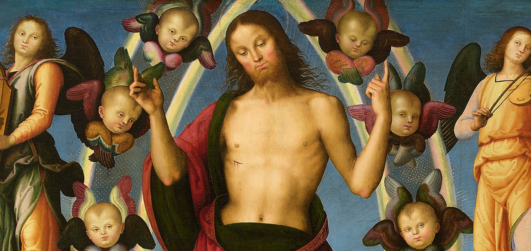 Christ’s feet rest on a cloud while the heads of cherubs arranged in an almond shape surround him.