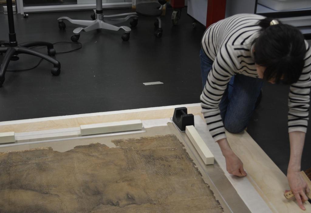 I conservatori specializzati di Arte Orientale su Carta e Seta del British Museum, abituati a realizzare nuovi supporti per le opere in grande formato su carta, hanno deciso di far aderire al cartone tre strati di carta giapponese sul verso.