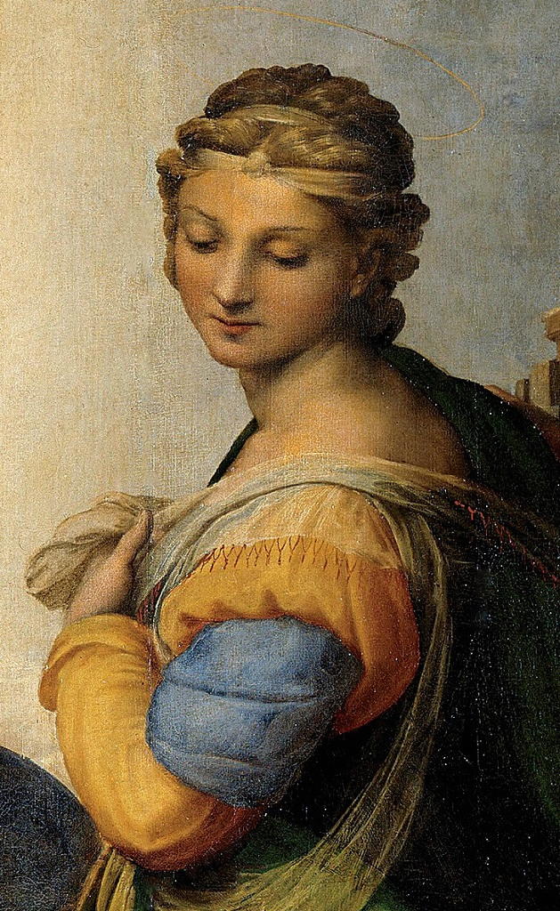 Kneeling at the feet of the Virgin, Raphael painted Saint Barbara while she turns her gaze towards the two little angels who have a funny, almost bored expression.