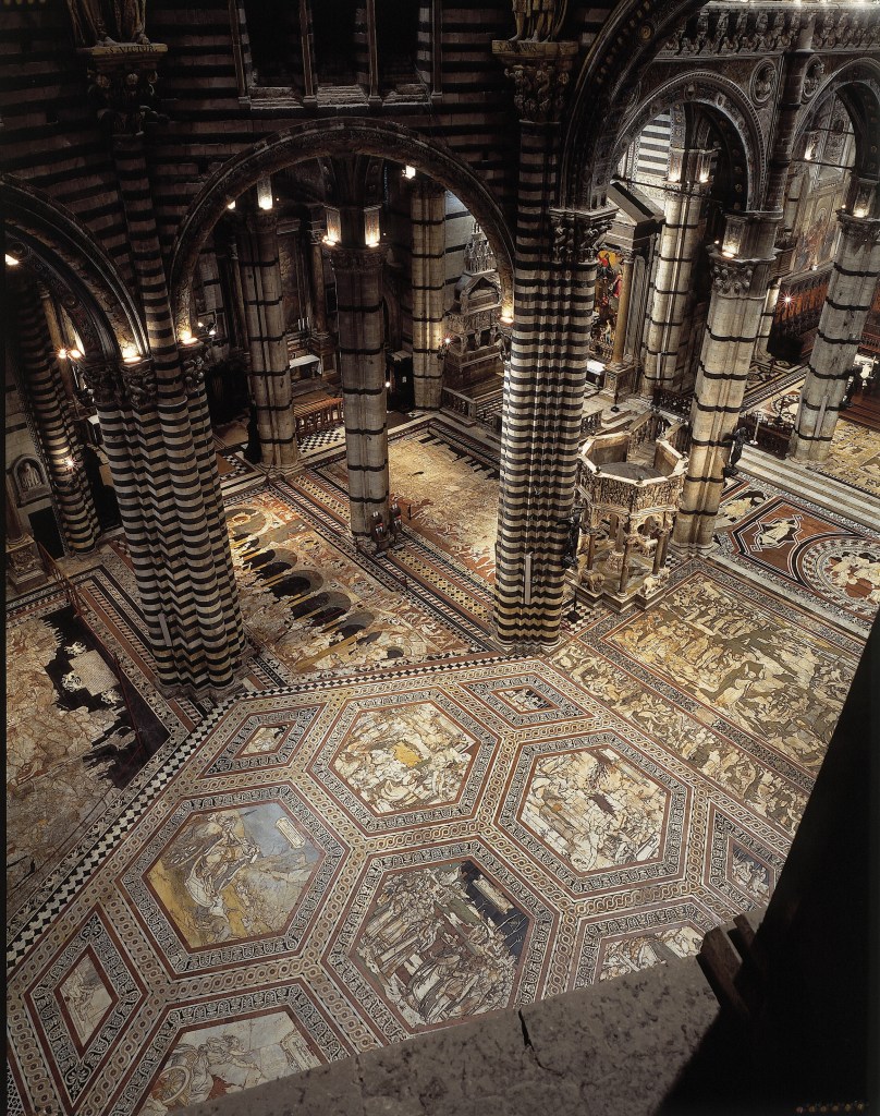 La prima visita prevista è quella guidata alla Cattedrale di Siena che in questo periodo dell’anno scopre il suo magnifico pavimento a commesso marmoreo. Sapete, le prime tarsie vennero eseguite in marmo bianco. Gli abili artigiani, dopo aver creato dei solchi con lo scalpello, li riempirono accuratamente con lo stucco nero. Procedendo con i lavori si decise di aggiungere anche marmi policromi e preziose tarsie lignee.