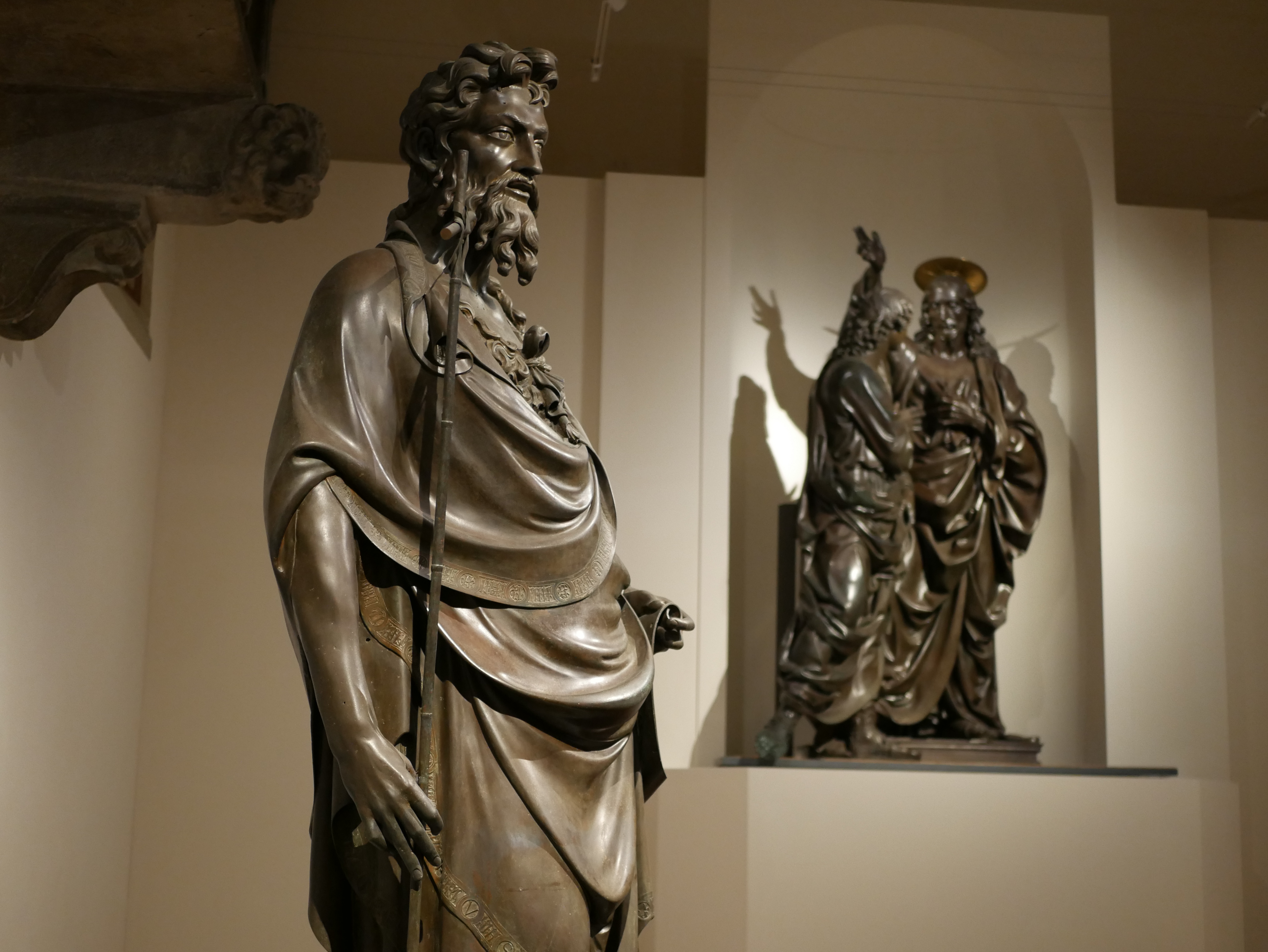 The sculpture was commissioned to the artist by the powerful Florentine guild of the Arte di Calimala, or merchants. 2.68 meters high, since 1993 for conservation reasons it has been housed inside the Orsanmichele Museum while the external niche is occupied by a copy.