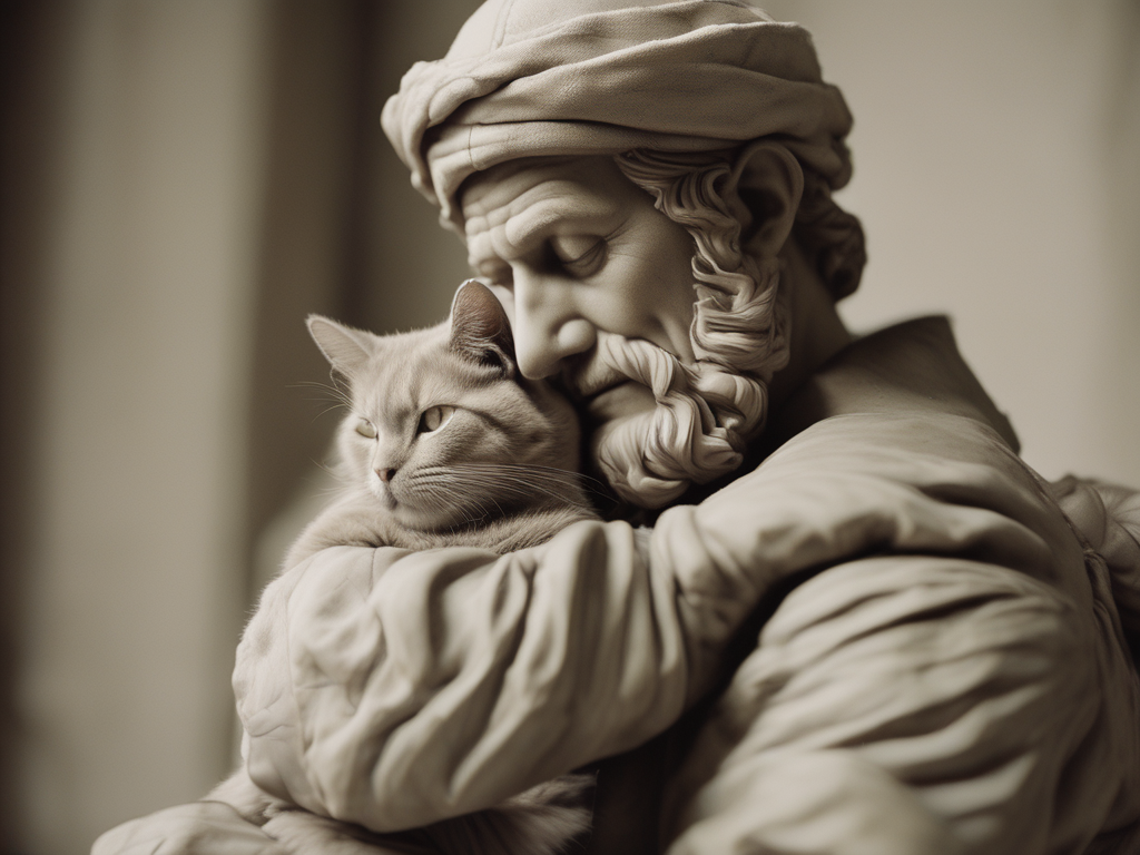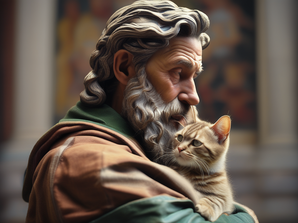 No one painted or sculpted an effigy of me with a cat in my arms, so I asked the artificial intelligence to make a virtual portrait of me with one of them.
