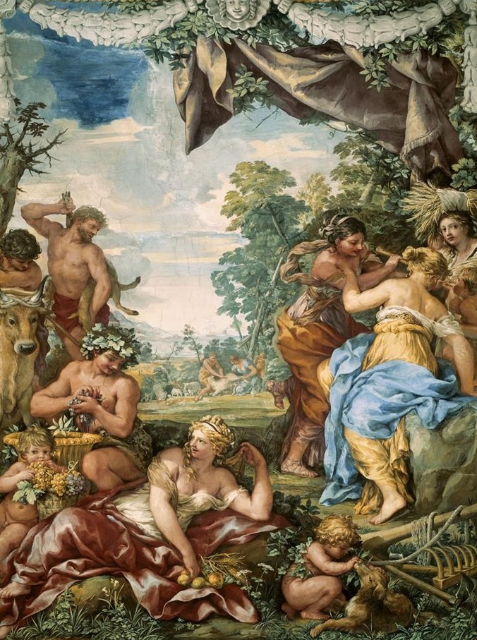 Nell’Età dell’Oro Pietro da Cortona affrescò una scena bucolica in cui pastori, fanciulli e animali convivono con armonia evocando l’epoca pacifica in cui governava Ferdinando.