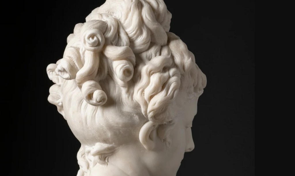 The bust of Spring belongs to a private collection. The elaborate curls that recall Canova’s style and the flowers in her hair and on her chest contrast sharply with the young woman’s melancholic expression.