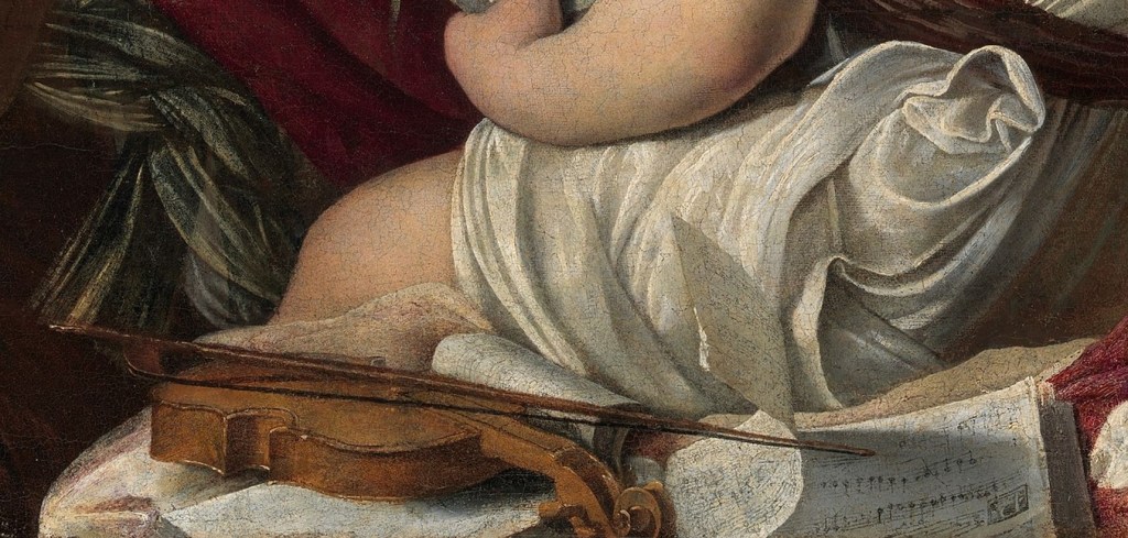 Da una parte, a sinistra, fa la sua comparsa un amorino alato che sta staccando un grappolo d’uva. Un gesto che può essere facilmente letto in chiave erotica suggellando così l’intimità esistente fra i tre giovani musicisti, uniti dalla musica e dalla passione erotica di cui sono intrise le prime opere di Caravaggio.