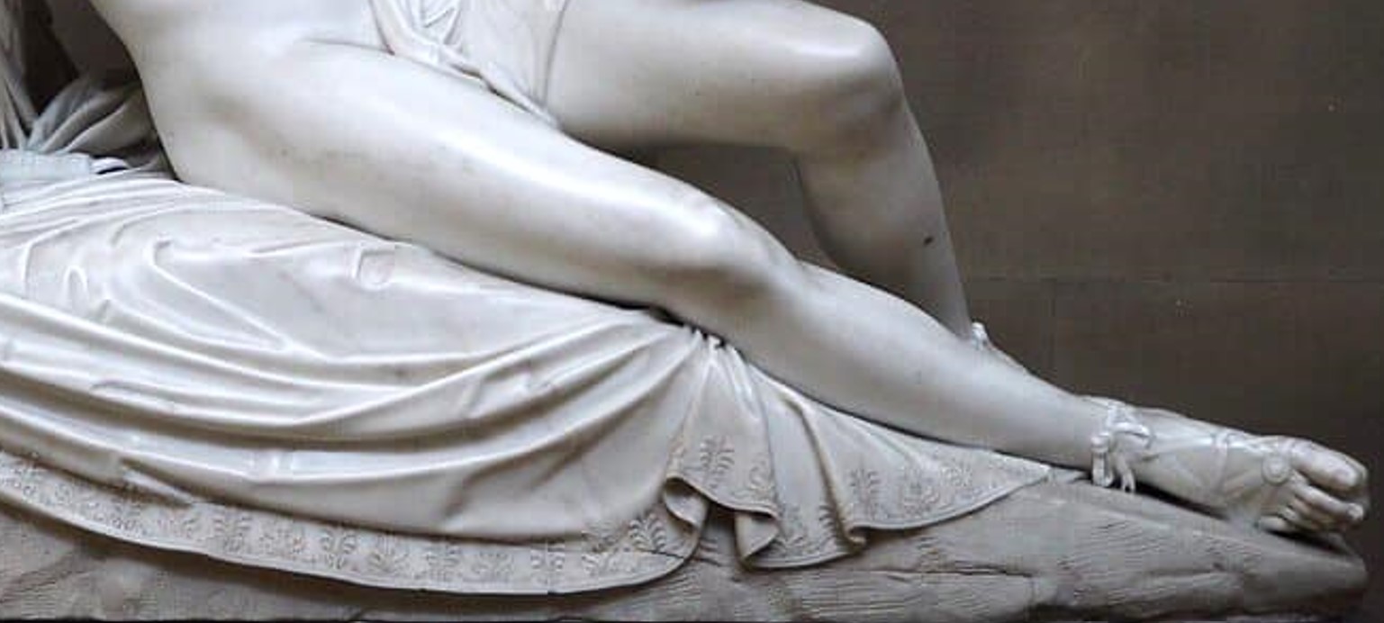 In this masterpiece Tadolini put his technical skill to good use, creating a smooth and polished surface that captures the light impeccably and the creation of minute details such as the embroidery on the drapery or the laces of the sandals.