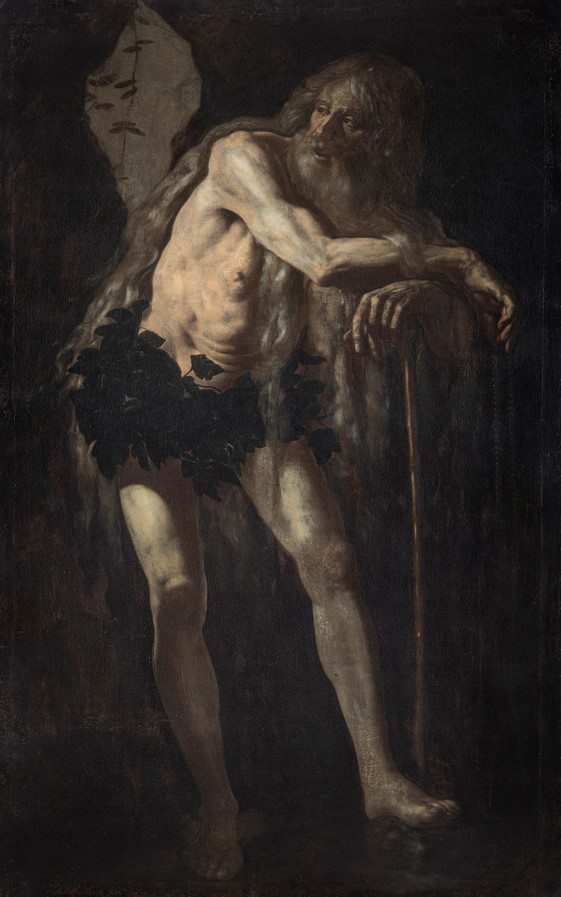 The scene is made even more crude by the dark background and the “Caravaggesque” light coming from the rear right, which highlights the physical fatigue of Onofrio who leans on the stick and his emaciated and tired figure, covered only by the leaves and characterized by the long beard and white hair.
