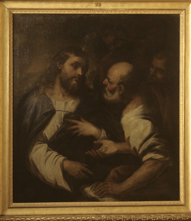 The painting depicts the Coin Tribute and, in particular, the moment in which Peter finds in the belly of a fish the money necessary to pay the tax for the temple for him and for Christ, as told in the Gospel of Matthew.