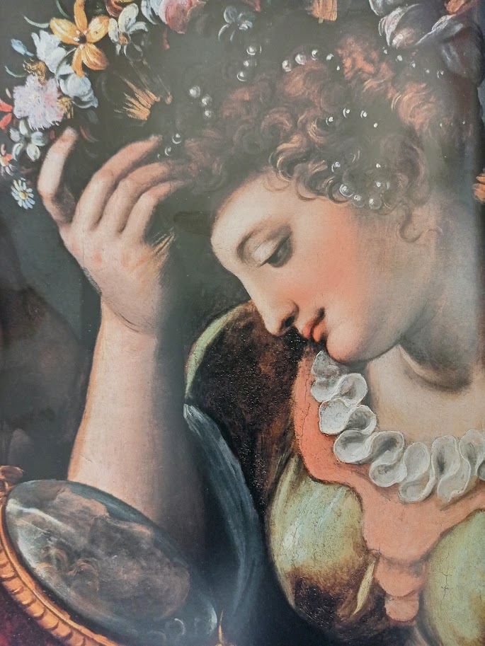 C’è un altro particolare che non può passare inosservato ed è la corona di fiori che si sta sistemando sul capo l’allegoria della Vita Attiva mentre si guarda allo specchio, al di sopra della complicata acconciatura arricchita con le perle.