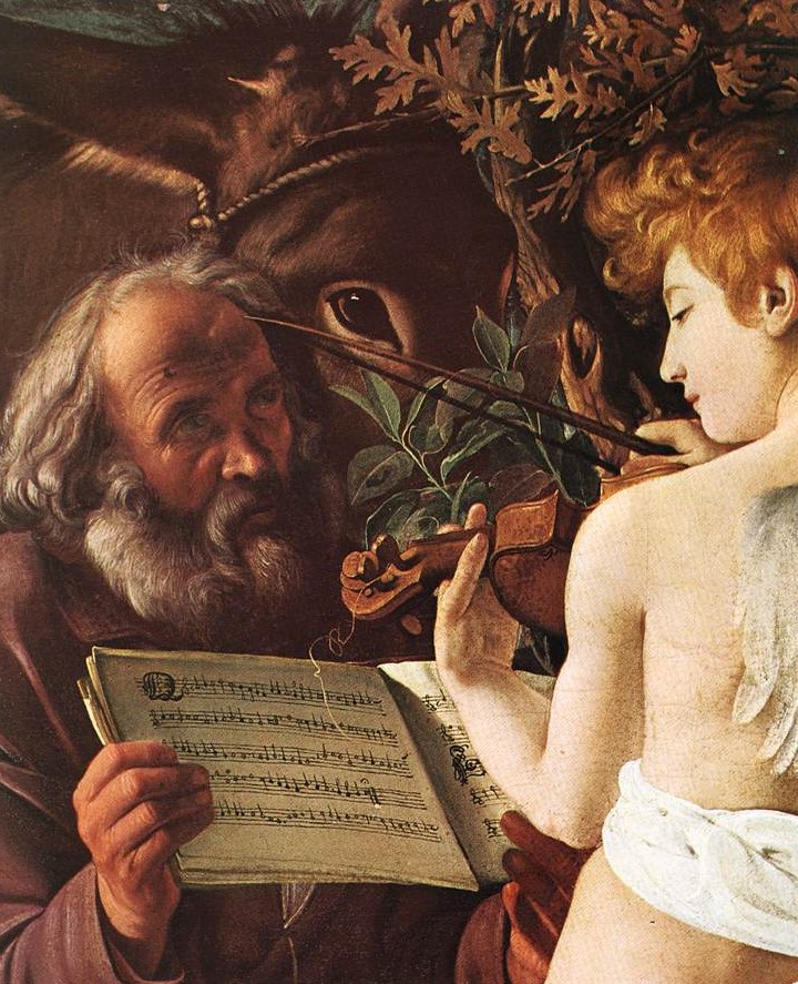 Giuseppe sorregge fra le mani lo spartito che l’angelo musicante segue. Sono state riconosciute fra quelle note il motetto dedicato alla Vergine che fu composto nel 1519 dal musicista Noel Baulduin sul Cantico dei cantici dal titolo Quan pulchra es.
