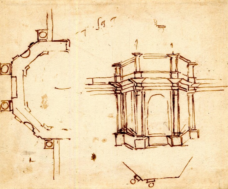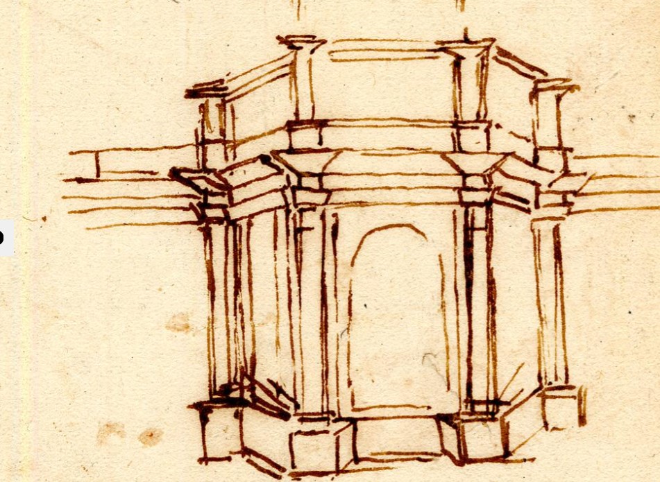 Il disegno architettonico che vi propongo oggi lo realizzai nel 1518 e riguarda la pianta e il prospetto in elevazione di una struttura semiottagonale, tracciate a penna e inchiostro bruno.
