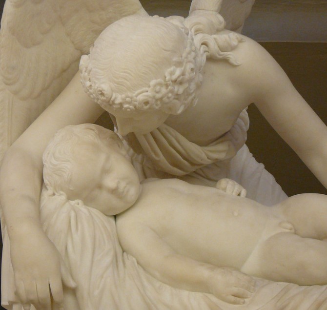 Observe the sheet under the child with those folds that shape the material in a detailed way. The angel’s hair styled with the crown of flowers highlights the artist’s undeniable mastery in working in marble.