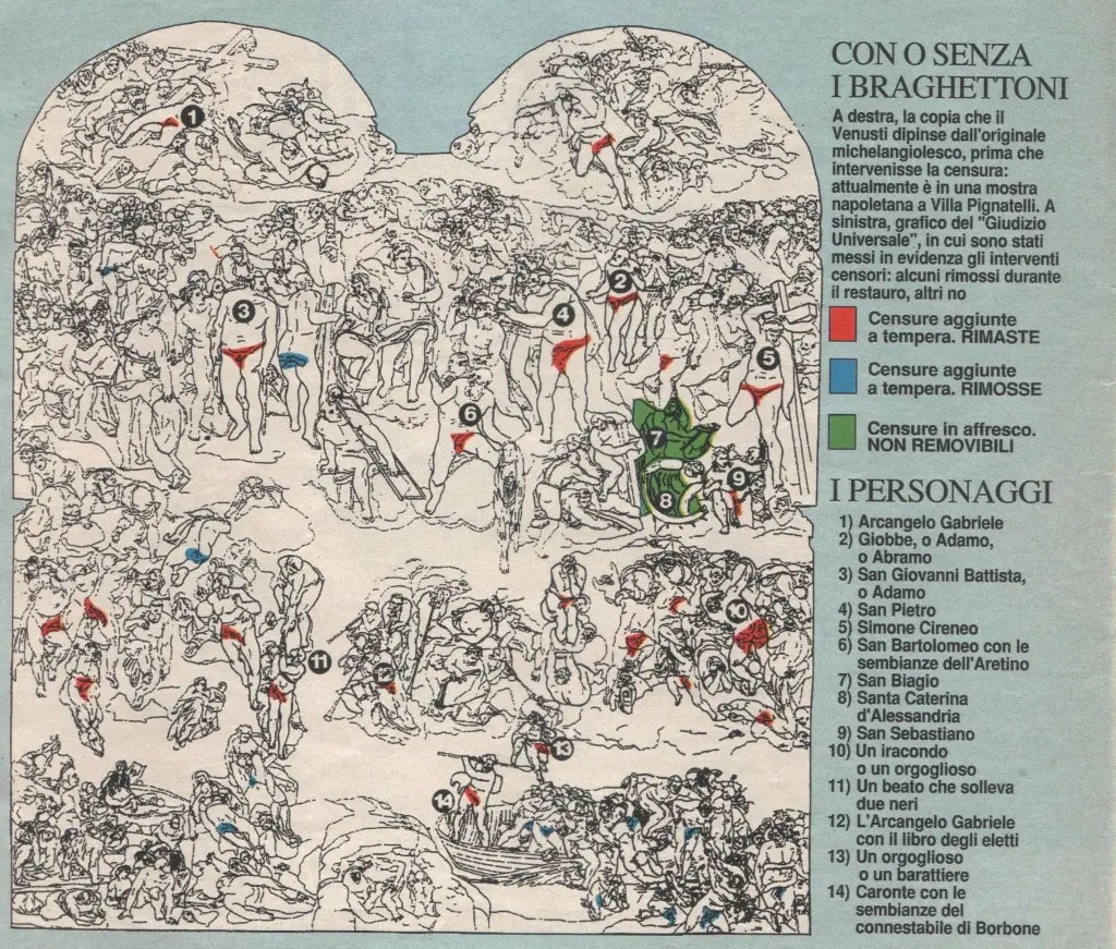 Poi la questione sfuggì di mano e oltre ai peni coperti come previsto inizialmente, nei secoli successivi si esagerò coprendo pure i culi con braghe sempre più grandi intervenendo sull’opera fino a metà dell’Ottocento, arrivando così a 44 braghe.