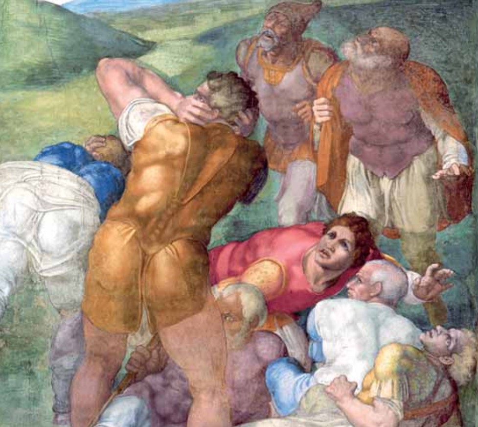 Unlike the frescoes of the vault and the altar wall of the Sistine Chapel, those of the Paolina present many pentimenti and corrections during the work.