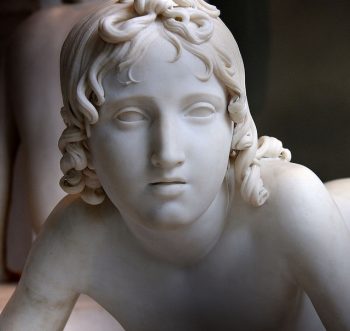 Bosio sculpted the young Giacinto half-lying down waiting to throw the discus, positioned right in front of him. The original title in French of the work is Hyacinthe blessé or “Wounded Giacinto” which suggests that the athlete has already been wounded.
