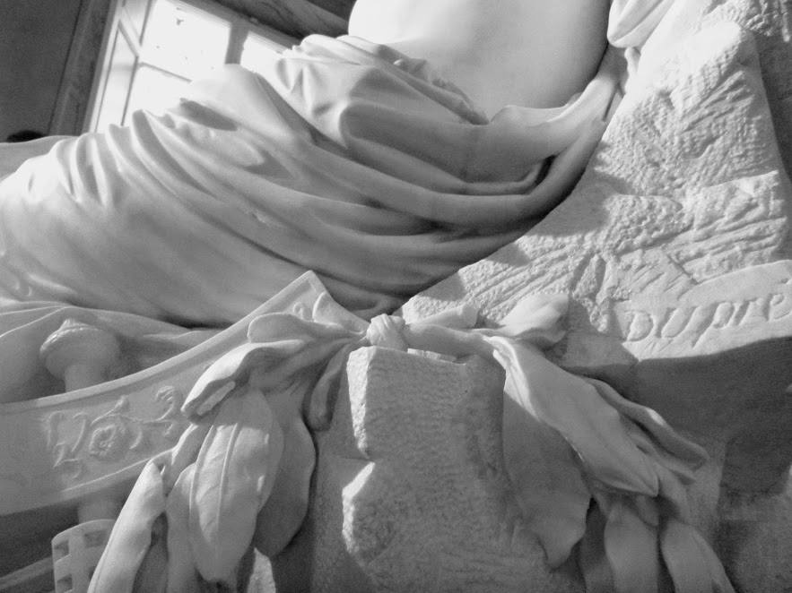 La parte sinistra del volto è segnata da una venatura nera naturale del marmo che sembra quasi uno sfregio voluto, venuto alla luce assieme al suo profondo dolore.