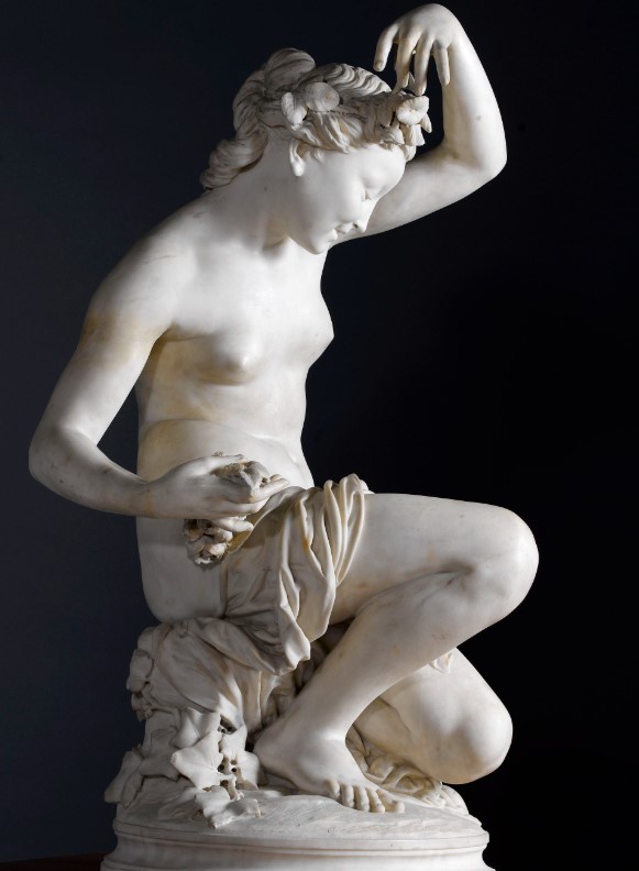 The woman is semi-kneeling with arms and legs arranged in contrapposto. The sculpture recalls the traditional Crouching Venus of ancient Rome.
