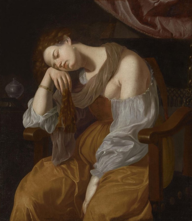 Maria Maddalena fu un soggetto particolarmente caro durante il periodo barocco. Artemisia in questo lavoro volle dipingere la donna in una posa che rende l’idea di una sofferenza composta, non gridata ma intima e logorante. Attorno a lei si vedono tutti quegli oggetti simbolici della vita lussuosa che conduceva prima del pentimento.
