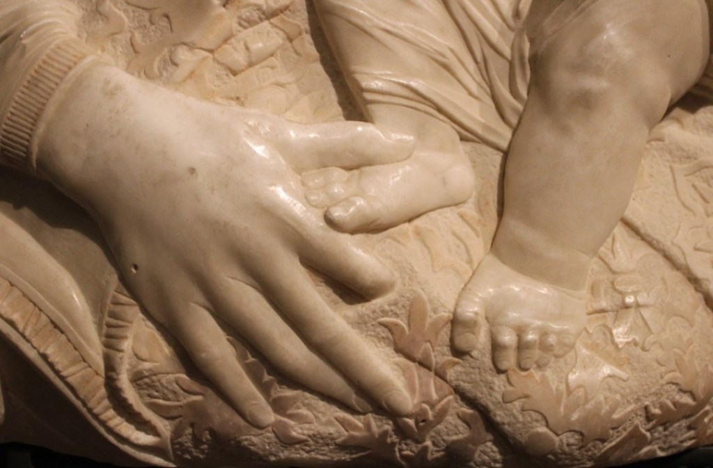The Florentine influences in this detailed bas-relief are clear. Observe with what care and mastery Gregorio di Lorenzo sculpted the damask fabric of the Virgin’s cloak, the cuffs of her dress and the care he put into first thinking and then sculpting that delicate gesture that makes the work memorable.