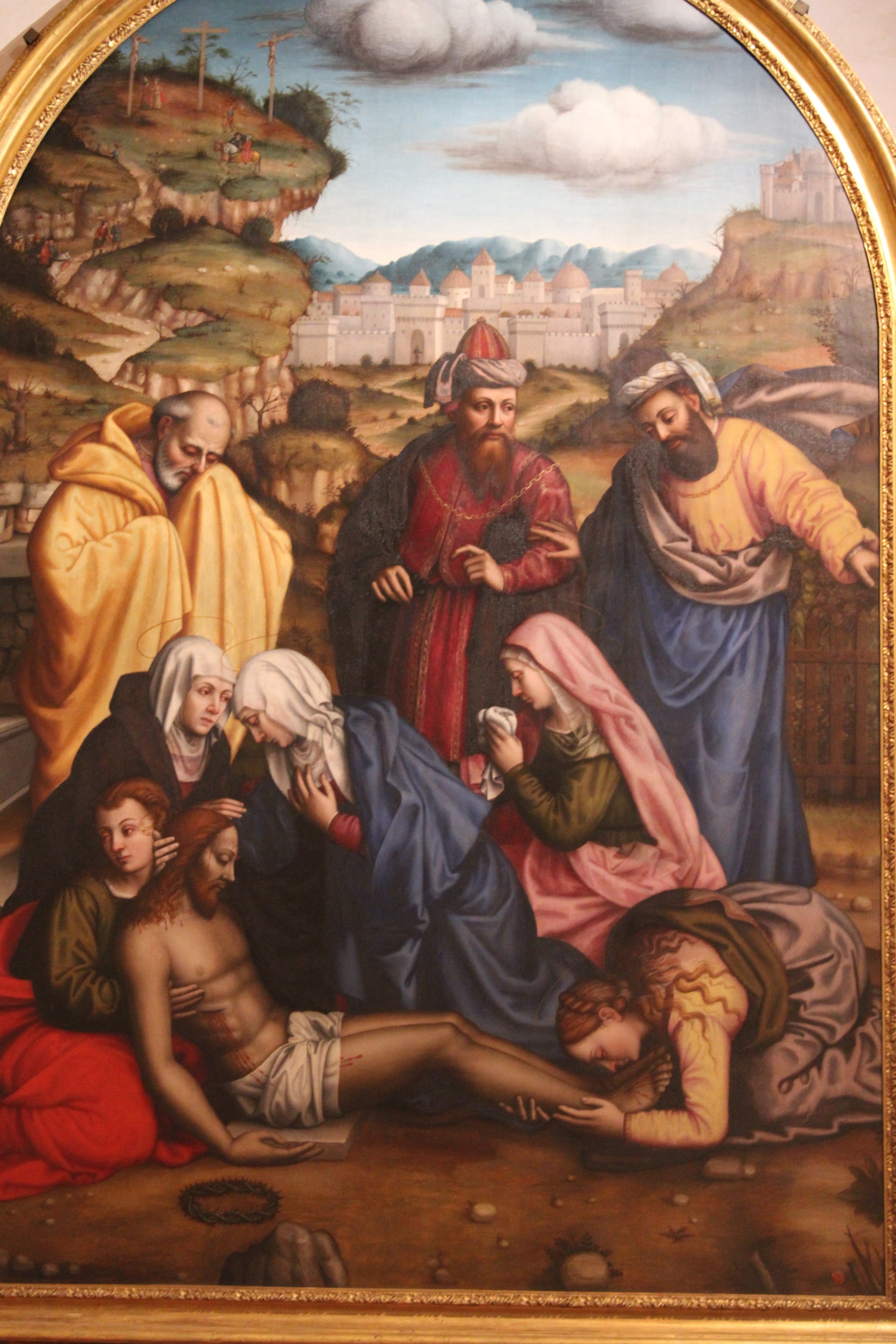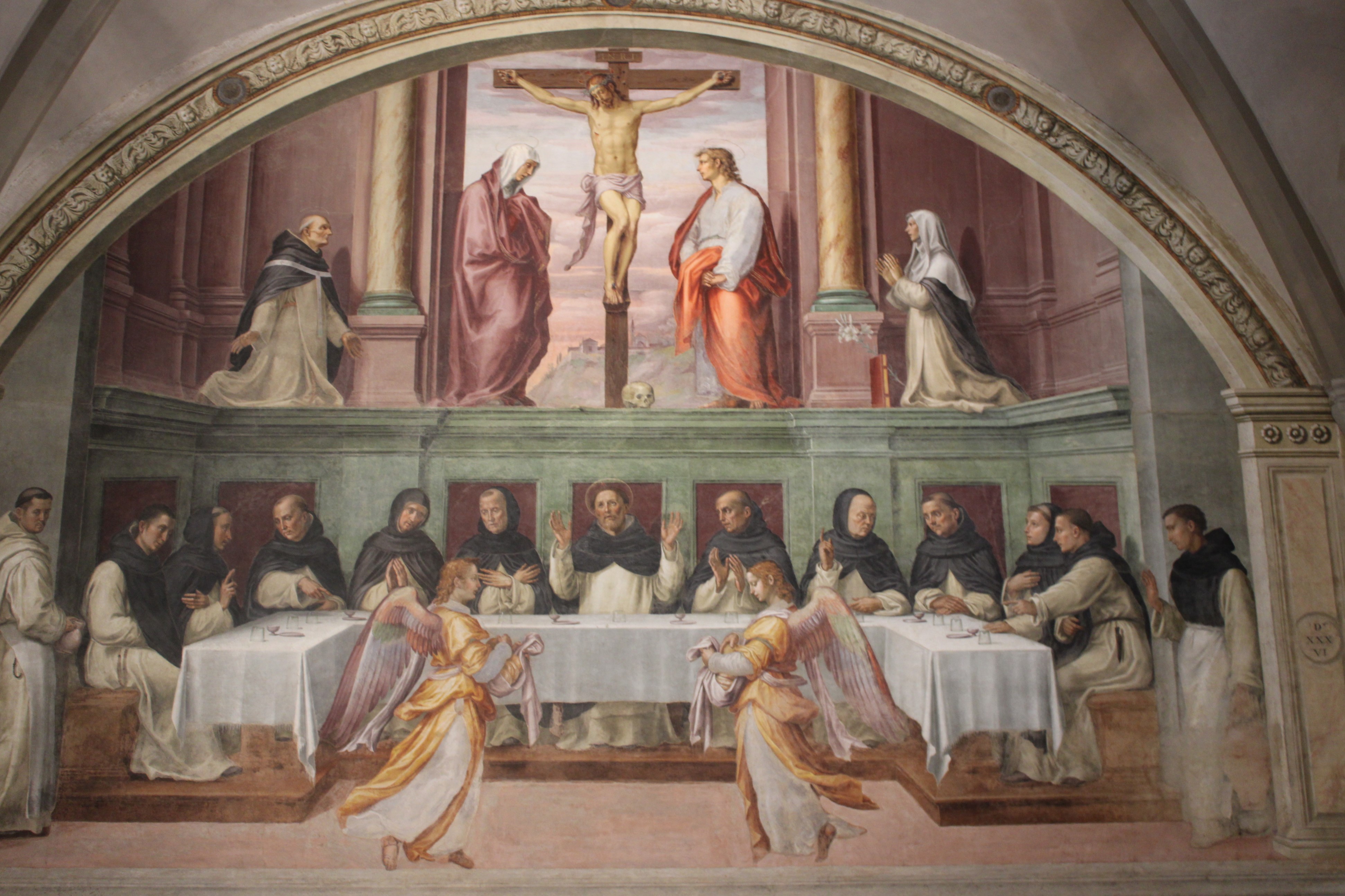 The friars sitting at the table with the founder of the Order in the center, had nothing to eat but miraculously two angels appeared with cloths full of bread. In the upper part, instead, he gave space to a Crucifixion with the Virgin, Saint John the Evangelist and kneeling Dominican Saints Antoninus and Catherine of Siena on the sides.