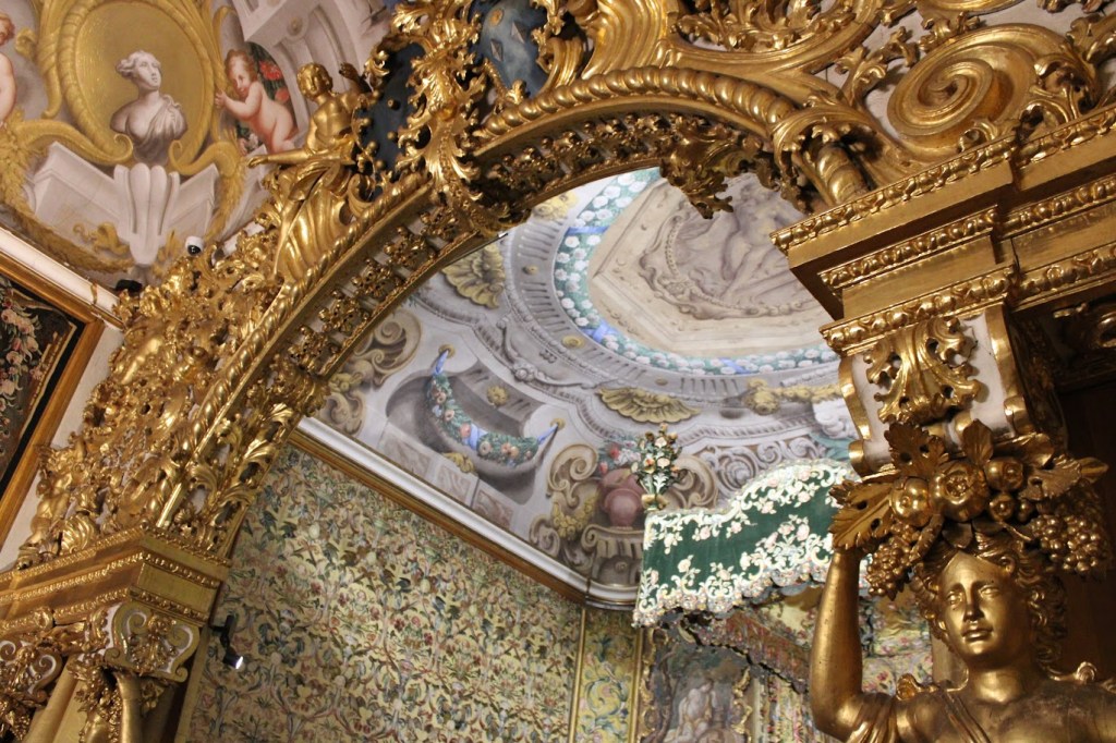 The Parade Apartment culminates with the bridal chamber, known as the Alcove. It was set up in 1688 for Carlo Mansi and his bride Eleonora with the scenic arch in gilded carved wood.