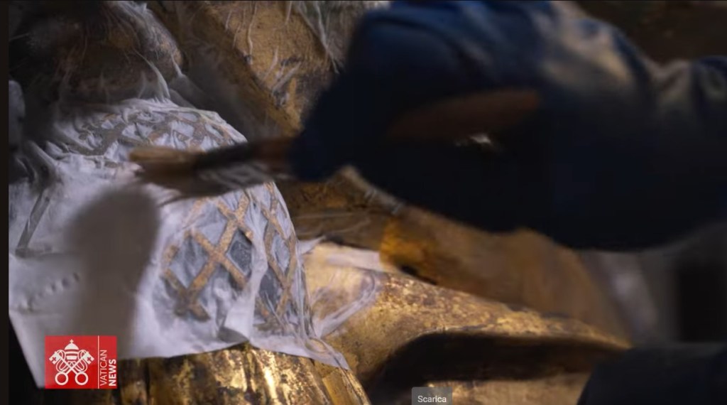 L’ingegner Alberto Capitanucci, responsabile dell’area tecnica della Fabbrica di San Pietro in Vaticano rivela la scoperta di un trattamento di fonderia, realizzato per ottenere un risultato straordinario. Il tendone fu realizzato in legno e rame ma dalle quattro aste torna alla luce un materiale inaspettato: il cuoio.