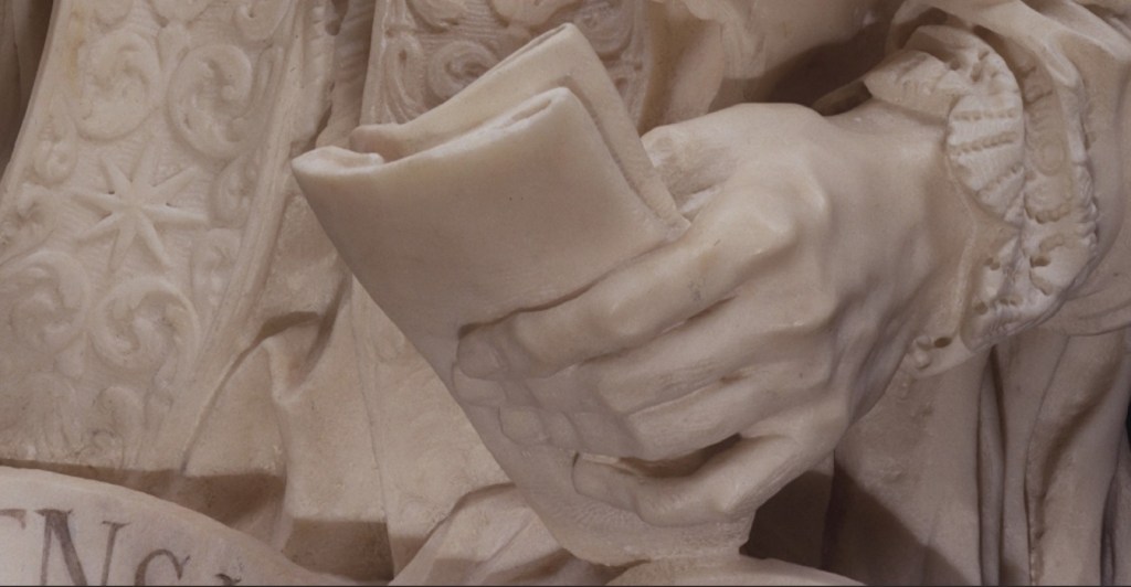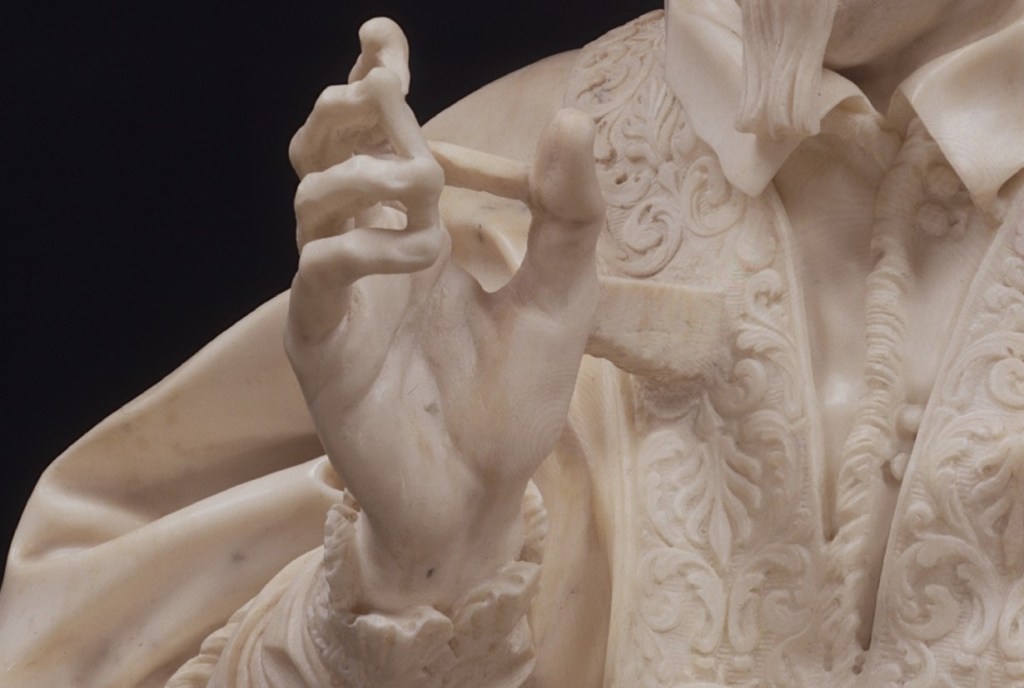 Look carefully at the raised hand of the pontiff in the act of blessing. It still has the support bridges, or rather marble partitions that Bernini had not yet eliminated between one finger and the other. This is a stratagem still used by sculptors today to prevent the most protruding and fragile parts from breaking during the work due to the blows inflicted on the marble.